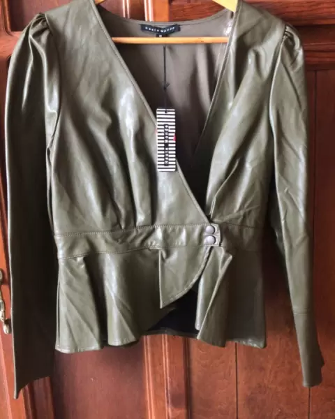 Blusa verde vinipiel. Blusa verde militar vinipiel con broches alado y escote v en perfectas condiciones nueva con etiqueta
