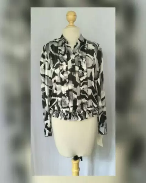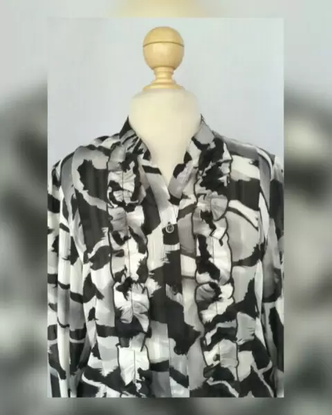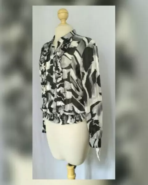 Blusa Vestir Estampada c/Escarolas. Blusa de vestir estampada en tonos NEGRO/BLANCO LINO/GRIS ACERO, cuello Mao, cierre p/botonadura frontal, escarolas en zona frontal, manga larga abullonada terminada en puño, elástico en cintura p/mejor ajuste. Talla 36 (MUY REDUCIDA, da mejor a 30/32). Dimensiones cms: 39.5 cms hombro, 52 cms axila, 36.5 zona baja (da hasta 58 cms p/el elástico), 63.5 largo manga. 100% poliéster. P/lavdo en casa.