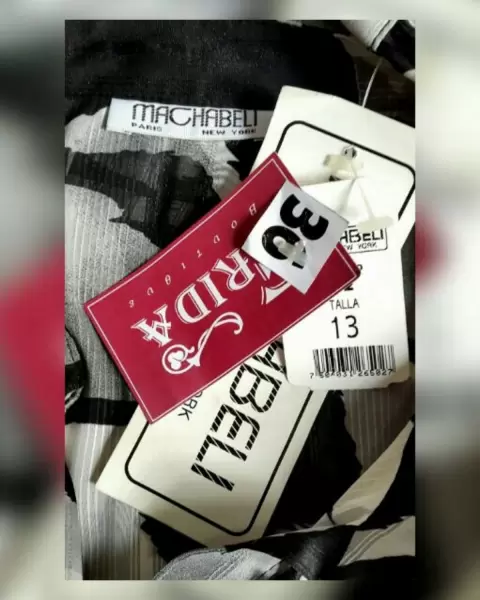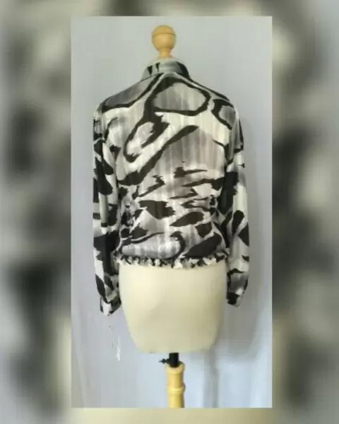 Blusa de vestir estampada en tonos NEGRO/BLANCO LINO/GRIS ACERO, cuello Mao, cierre p/botonadura frontal, escarolas en zona frontal, manga larga abullonada terminada en puño, elástico en cintura p/mejor ajuste. Talla 36 (MUY REDUCIDA, da mejor a 30/32). Dimensiones cms: 39.5 cms hombro, 52 cms axila, 36.5 zona baja (da hasta 58 cms p/el elástico), 63.5 largo manga. 100% poliéster. P/lavdo en casa.