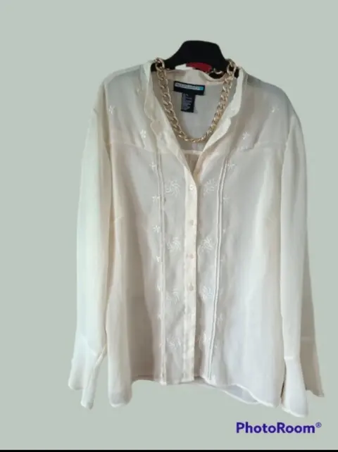 Blusa vintage con bordado. En perfectas condiciones,con detalle de bordado, limpia versatil la puedes usar formal, casual o como sobre camisa, detalle de bordado al frente y manga con puño campanaMedidas📝Aaxila a axila 58cmLargo 73cmManga 62cm