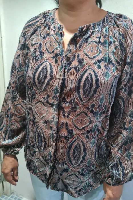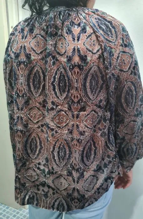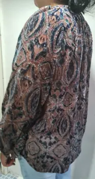 Blusa estilo boho super cómoda y fresca, es talla S sin problema da a una M porque es suelta, sin detalles, la tela tienen poco de transparencia, queda abajo de la cintura, la manga mide 52 cm de hombro a puño
