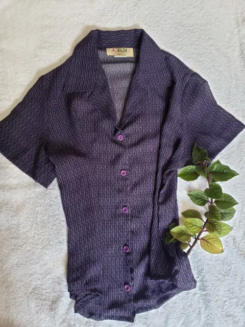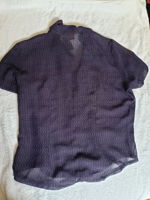 Blusa vintage transparencias. Una sola puesta, transparencias, tela fresca color negro con tramas moradas, manga corta sin hombreras.
