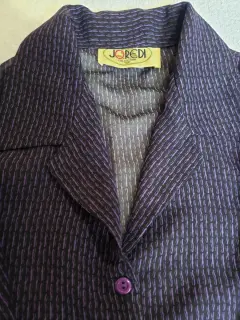 Una sola puesta, transparencias, tela fresca color negro con tramas moradas, manga corta sin hombreras.