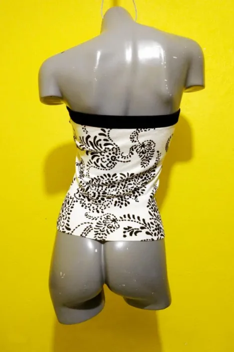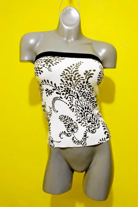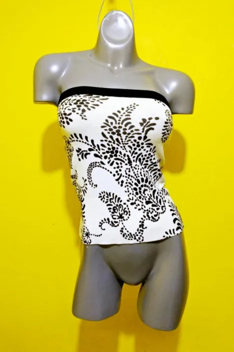 COLOR BLANCO CON NEGRO, STRETCH 16% NYLON, TEJIDO DE PUNTO, STRAPLESS, RESORTE EN ESCOTE, TALLA EXTRA CHICA, MEDIDAS DE UNA CARA: AXILA A AXILA 37 (ESTIRA HASTA LOS 54 CM), LARGO 41 CM.