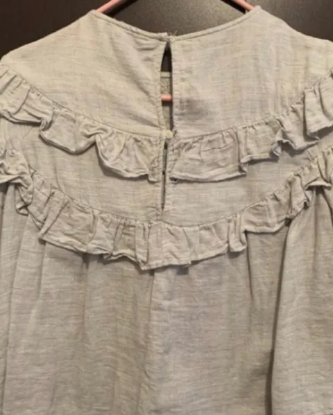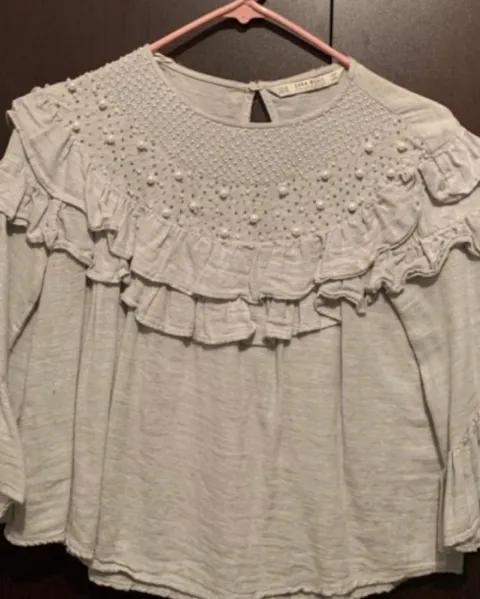 Blusa con olanes, marca Zara, talla XS pero perfectamente queda en S, viene amplia, con cuentas color perla y olanes