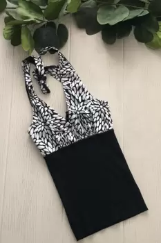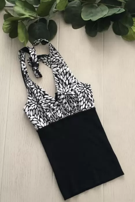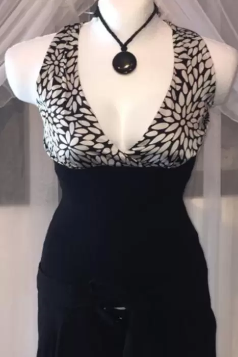 Blusa strapless negra con blanco, la tela de abajo es algodon y estira la parte de arriba es tela viene con forro para no trasparentar y se amarra detras en el cuello.
