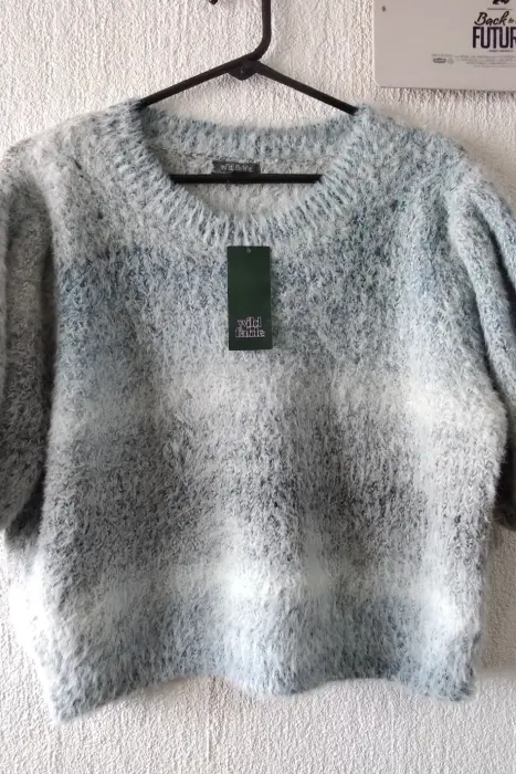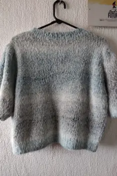 Blusa/Suéter gris Spacedye. Sueter/Blusa de manga corta de globo que ofrece un poco de volumen, cuello redondo, mezcla de nylon para mayor suavidad y calidez. Color: Gris/Azul cielo. Diseño Space Dye.