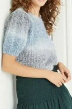 Sueter/Blusa de manga corta de globo que ofrece un poco de volumen, cuello redondo, mezcla de nylon para mayor suavidad y calidez. Color: Gris/Azul cielo. Diseño Space Dye.