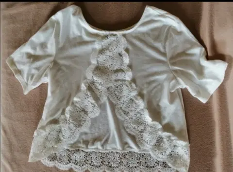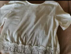 Blusita con detalles bordados en la parte de abajo y abertura en la espalda igual con bordado, medídas de mangas 22 cm, largo 48 cm.