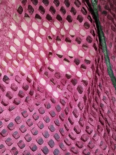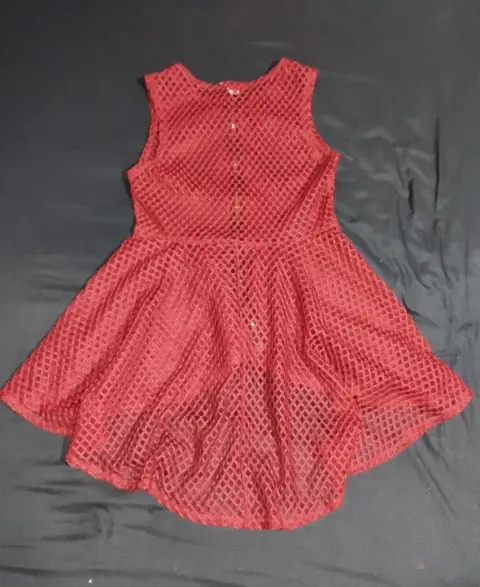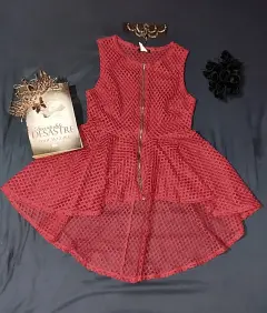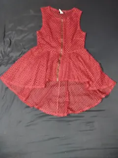 Bonita blusa de red, transparente, color vino, se encuentra en perfecto estado, fue usada una o dos veces con cuidado, tiene cremallera en la parte frontal y el corte es asimétrico, más corto de enfrente. No recuerdo que talla es pero calculo una "S-M"La parte frontal llega un centímetro bajo el ombligo 50cm del cuello para abajo y la parte posterior debajo del gluteo 80cm del cuello para abajo