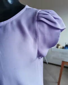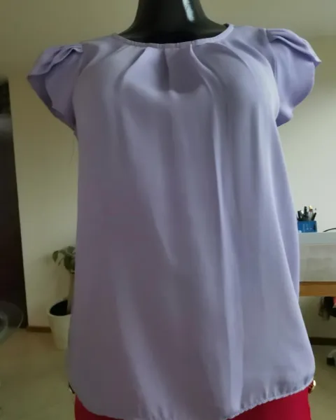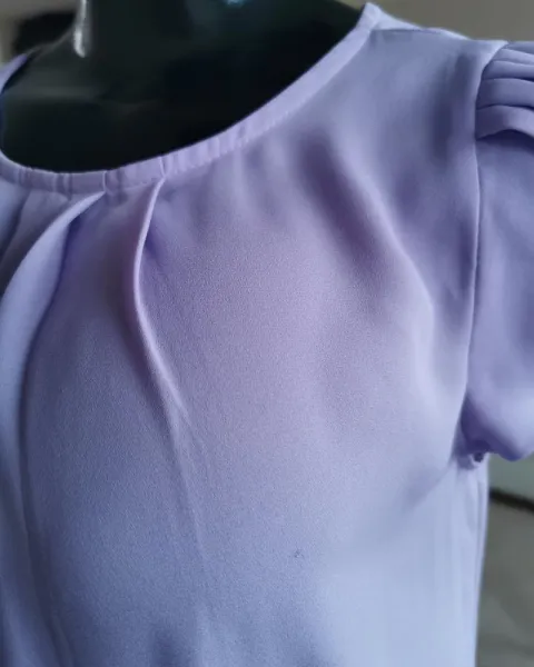 Blusa de manga corta tipo sombrilla, es corte recto, color lila, cuello redondo