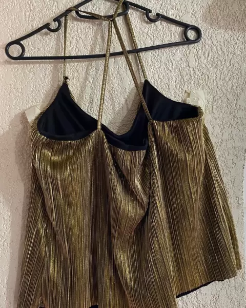 Blusita color dorada, de tirantes, de la parte de la espalda a los tirantes son cruzados, ideal para usar sin bra porque tiene fondo negro y no se transprenta. Genial para combinar con legging negro, la blusa es corta a la altura de la cadera, talla 2 de la marca Lob