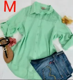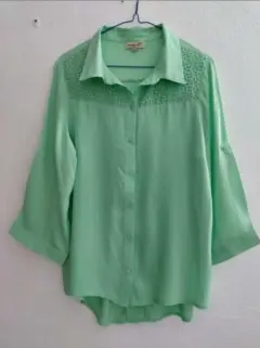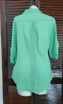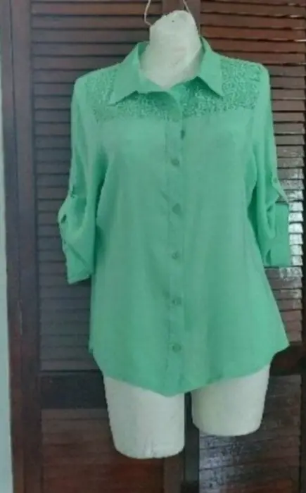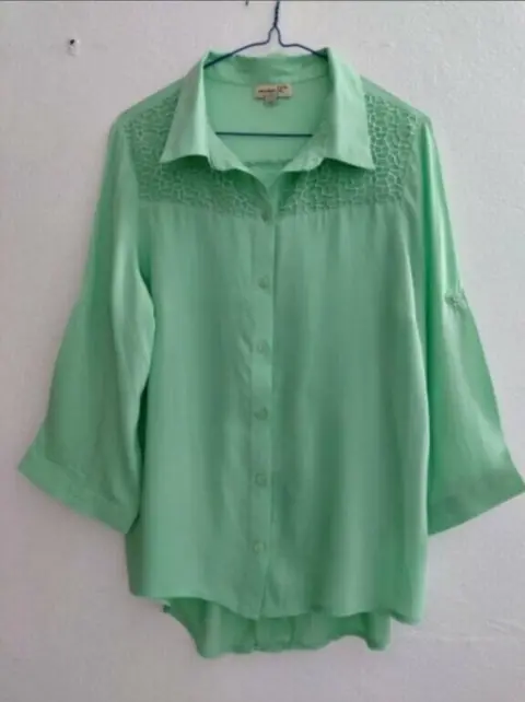 Blusa verde claro, muy linda, manga 3/4 con acabado de red en hombros y parte de atrás. No tiene strech, luce bella.Axila a axila: 51 cm,Hombros: 39 cmLargo frente: 61 cm,Largo trasero: 70 cm. Tela 100% rayón.Sin detalles y en perfecto estado.