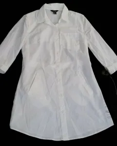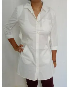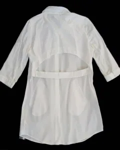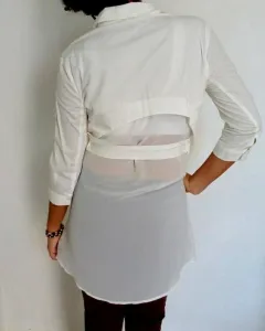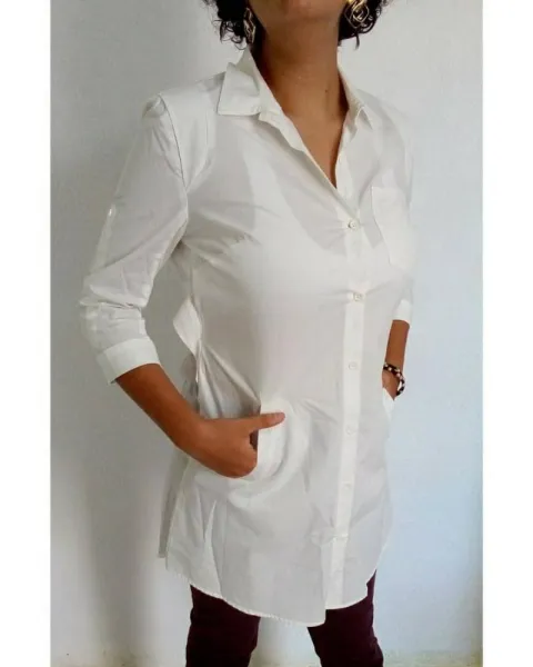 Blusón blanco. Blusa larga color blanco, la tela del frente es tipo camisa y por la parte de atras es tela vaporosa y tiene una cinta por atrás y las mangas pueden recortarse, cuenta con un par de bolsas al frente, es talla M, muy fresca y en perfecto estado nunca se estrenó.Axila 51cmHombros 41cmLargo 85cm