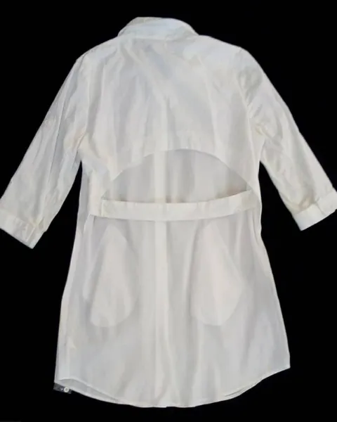 Blusa larga color blanco, la tela del frente es tipo camisa y por la parte de atras es tela vaporosa y tiene una cinta por atrás y las mangas pueden recortarse, cuenta con un par de bolsas al frente, es talla M, muy fresca y en perfecto estado nunca se estrenó.Axila 51cmHombros 41cmLargo 85cm