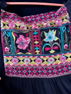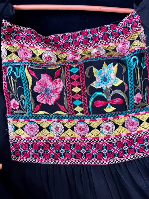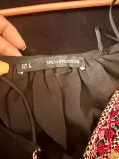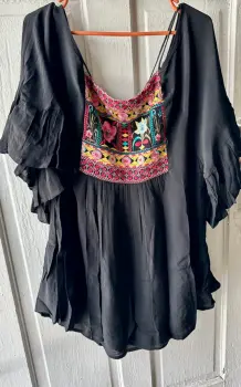 Hermoso blusón color negro con estampado bordado en pecho talla S pero queda bien a una talla M, puedes usarlo con los hombros descubiertos o con la manga arriba, justo para clima caluroso la tela es fresca