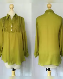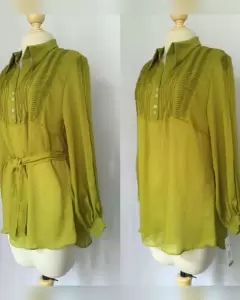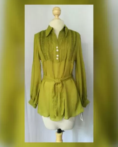 Blusón con Cinturón. Blusón color VERDE OLIVO, cuello clásico c/solapas, multiplisado en zona de busto c/botonadura blanca c/destellos verde brillante, manga larga terminada en puño, trabillas en cintura y cinturón mismo tejido p/mejor ajuste. UNITALLA (da a M/L). Dimensiones cms: 40 hombro, 54 axila, 51 cintura, 67 zona baja, 72.5 largo, 57.5 largo manga. 40% algodón, 40% poliéster, 20% licra. P/lavado en casa.