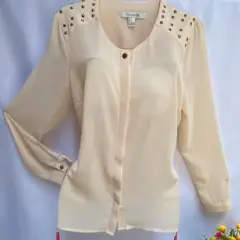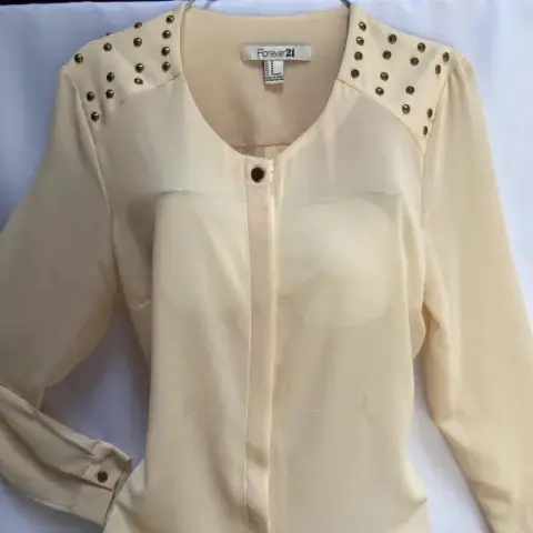 Blusón en color nude en tela de gasa semipermanente. Escote redondo, corte canesú en los hombros y estoperoles redondos. Botones ocultos en la parte de enfrente, sólo uno visible en la parte superior en color dorado metálico. Manga larga, puños y aletilla con botón. Tablón invertido en la parte de la espalda y canesú. Talla: M (30-32) Puede quedar hasta una talla L. Marca: FOREVER 21.