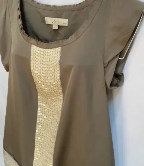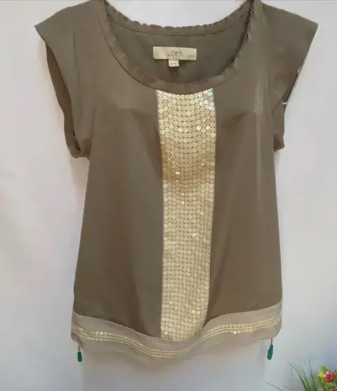 Blusón en tela tipo gasa en poliéster. Blusón en tela tipo gasa en poliéster color verde olivo, escote en “U” En centro del blusón tiene una línea llena de lentejuelas en color beige aperlado. En el ruedo de la blusa franja de color claro. De manga corta, en espalda corte canesú y ligero fruncido en la espalda. Talla: XS (20-22) Quedé hasta una talla S. Marca: LOFT.