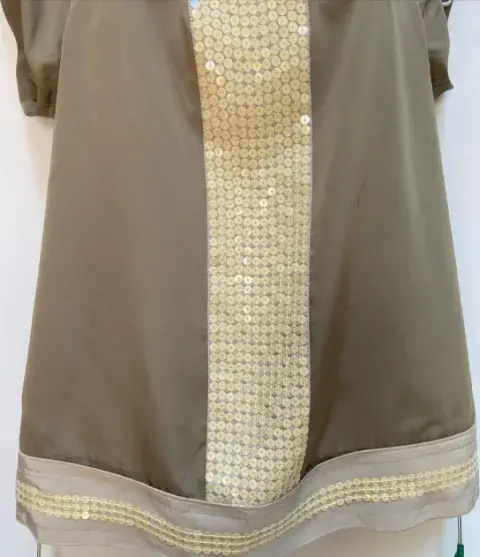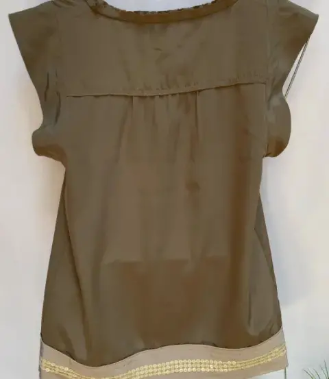 Blusón en tela tipo gasa en poliéster color verde olivo, escote en “U” En centro del blusón tiene una línea llena de lentejuelas en color beige aperlado. En el ruedo de la blusa franja de color claro. De manga corta, en espalda corte canesú y ligero fruncido en la espalda. Talla: XS (20-22) Quedé hasta una talla S. Marca: LOFT.