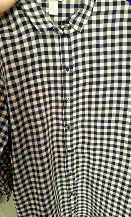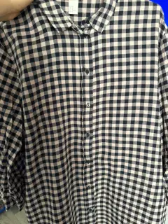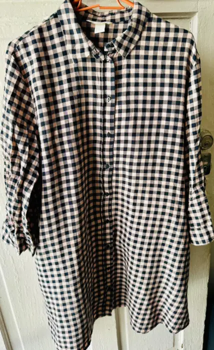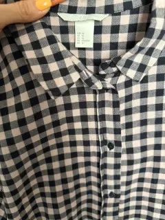 Blusón estampado cuadros rosa con negro. Blusón tipo camisa estampado cuadros rosa claro con negro, trae bolsas a los lados manga larga talla L tela fresca