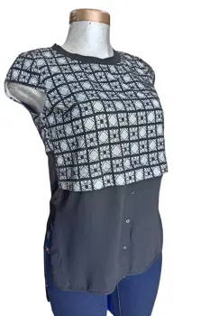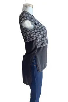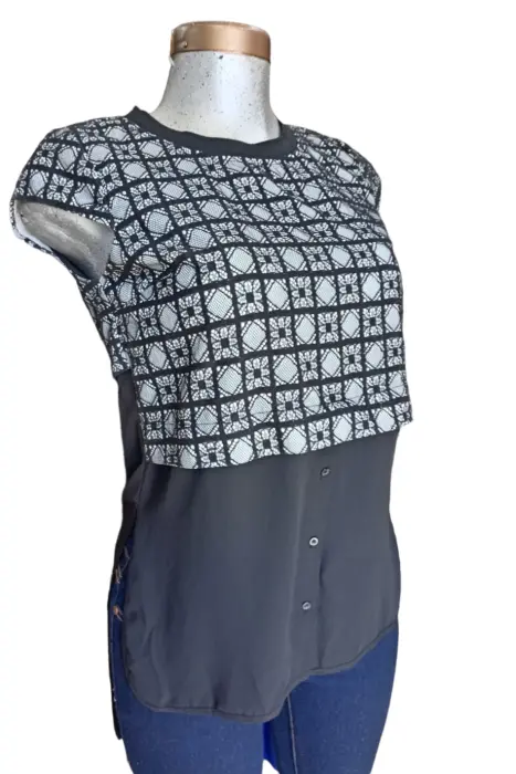 BLUSON FORMALCUELLO REDONDOESTANPADO DE ENCAJE A CUADROSCOLOR NEGROMAS LARGA DE LA PARTE DE ATRASES UNA SOLA PIEZA, VIENE PEGADO LAS DOS PARTES, SIMULA CAMISAENVIO INMEDIATO