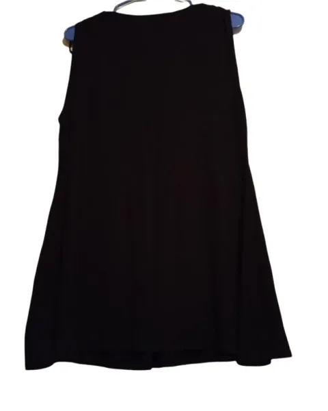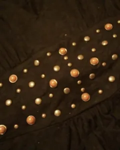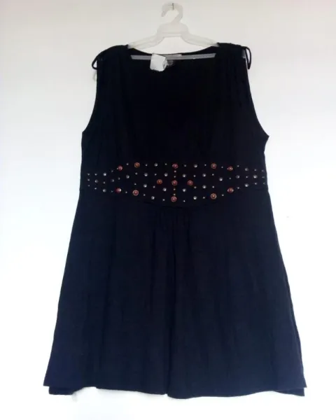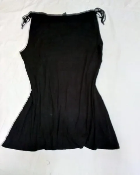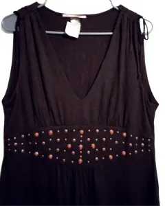 Blusón negro strech L. Hermoso blusón de algodón con licra, estira mucho y la tela es muy suave. En los hombros tiene tiritas para plegarlos. Escote en V y hermoso bordado con ojillos y estoperoles que simulan un cinturón. De atrás es liso.
