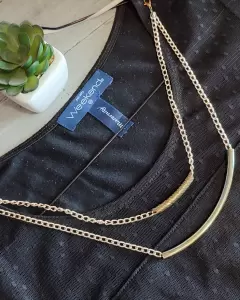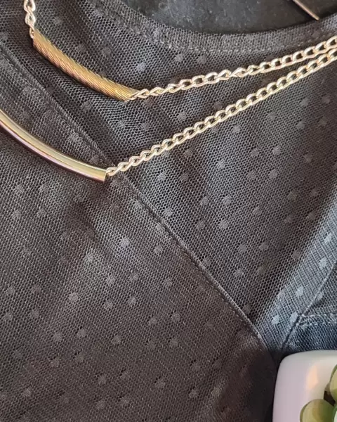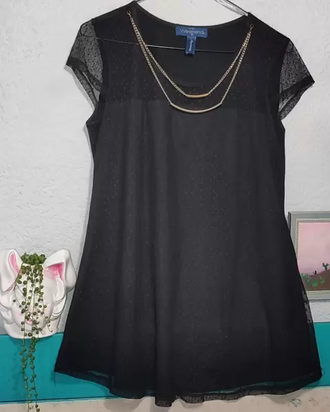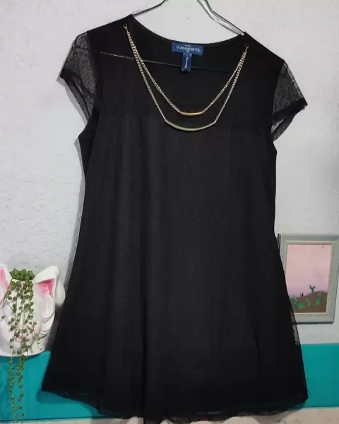Bonito Blusón negro con transparencia al frente y manga corta ,cuello redondo y detalle collar metálico dorado desmontable talla m ideal para un evento casual
