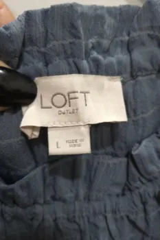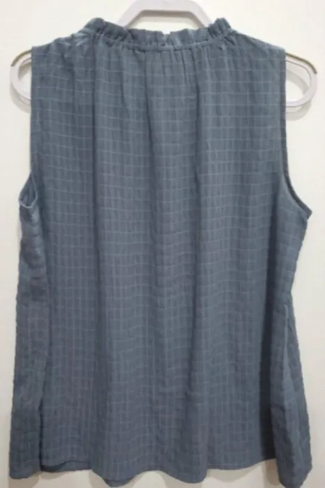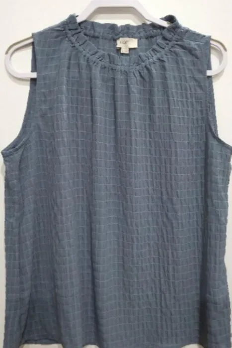 Blusón sin Mangas Loft. Blusón color azul grisáceo. La tela es poliéster similaral crepé y forma cuadritos como se ve en la foto.El cuello tiene resorte.Talla L, viene amplia, incluso podría quedar a XL.Medidas aproximadas: 55cm de axila a axila,42 cm de largo a partir de axila.*TODAS MIS PRENDAS SE DESINFECTAN CON LYSOLLAVANDERIA PARA TU MAYOR TRANQUILIDAD*