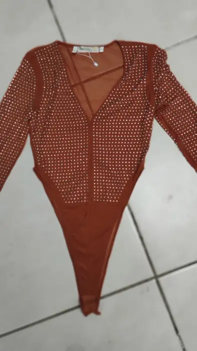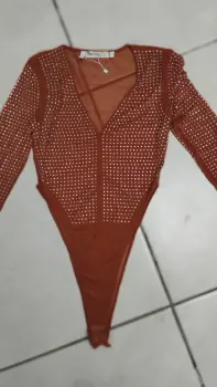 Hermoso body colos chedron con aplicación de brillo ,manga larga cuello uv tela transparente .