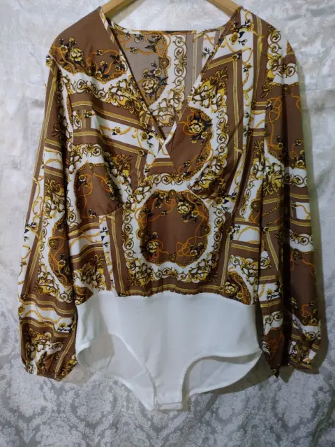 Body con estampado de grecas doradas, completamente nuevo, bastante amplió con cuello en v