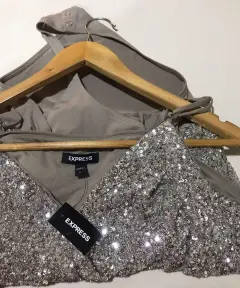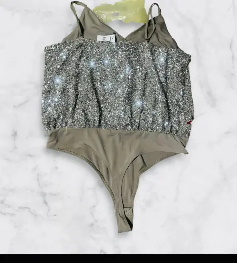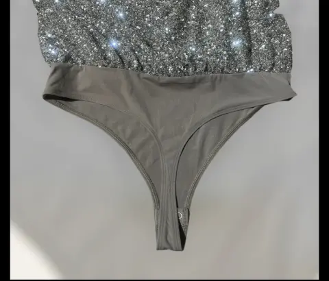 Precioso body de lentejuelas , talla Lla tela 95%poliéster y 5% spandex (estira )Panti blusa botoncitos en la parte de abajo tirantes ajustables . Es color beige en tono oscuro , las lentejuelas son color plateadas , la parte de abajo donde se abrocha es tipo tanga