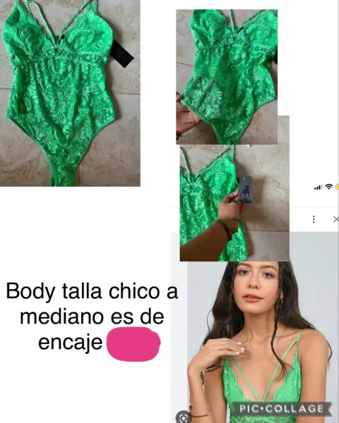 Body color verde con etiqueta es de encaje talla chica le da a una mediana no tan llenita. Queda muy bonito anexo foto de cómo se ve puesto.