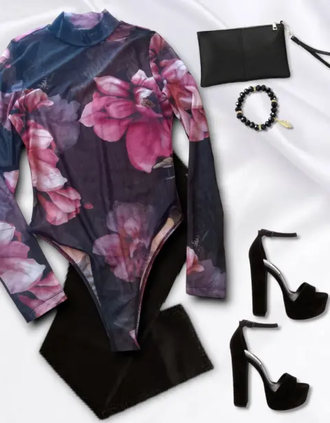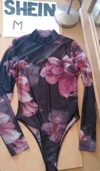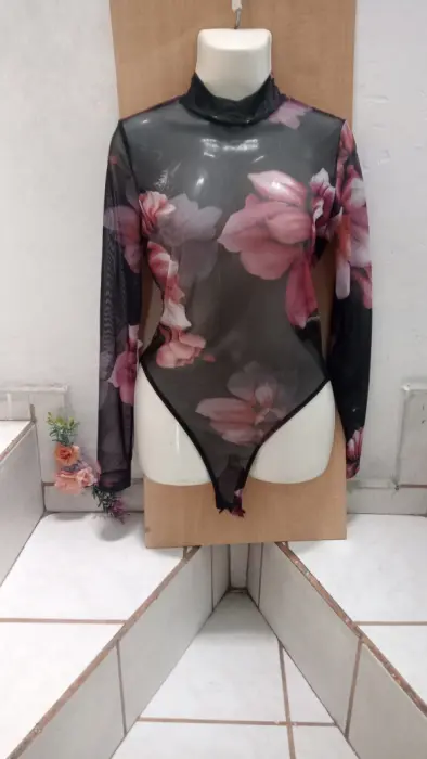 Body estampado semi transparente. Tela tipo malla pequeña strech (no pica ni raspa)Talla M (estira, queda a 7-9)Color negra con flores rosas super coquetaSe abrocha del panti con tres brochesitosDe segunda oportunidad, pero sin detalles