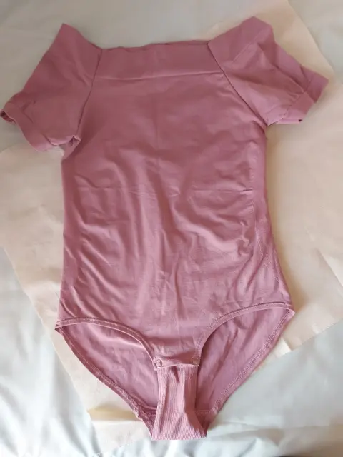 Body elastico, color palo de rosa, manga corta, hombros descubiertos, en excelente estado