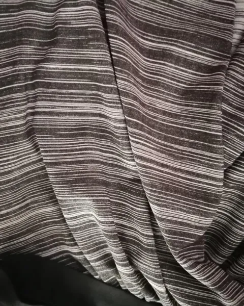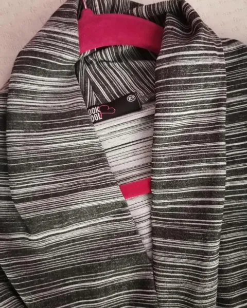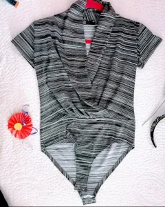 Body rayado de líneas grises y blancas, con broche en entrepierna, es talla extra chica pero queda hasta mediana, mangas cortas.