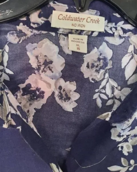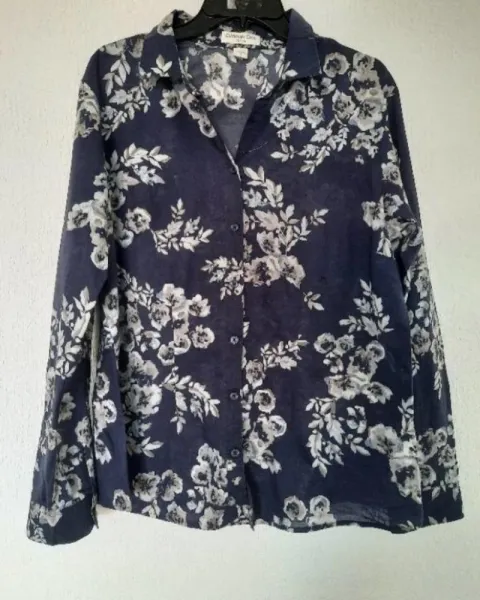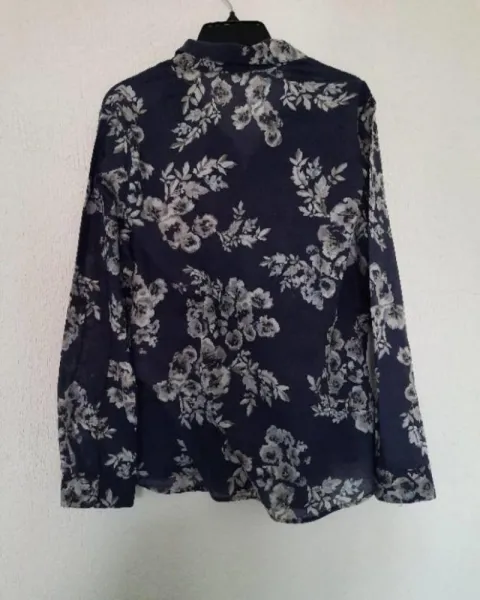 Camisa azul de flores 2. Talla 16, tela delgada fresca, azul marino con flores ,54 cm de axila a axila