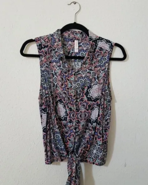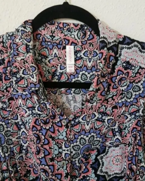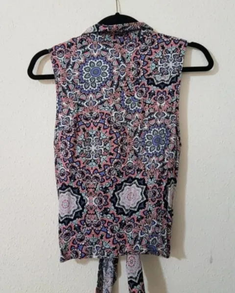 Bonita camisa de botones manga corta, con nudo al frente. con estampado de mandalas en colores rosa, morado y celeste. Estilo boho