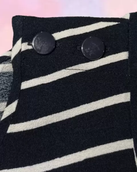Coqueta blusa, azul marino con blanco. Detalle de botones en el hombro y manga tipo olan.