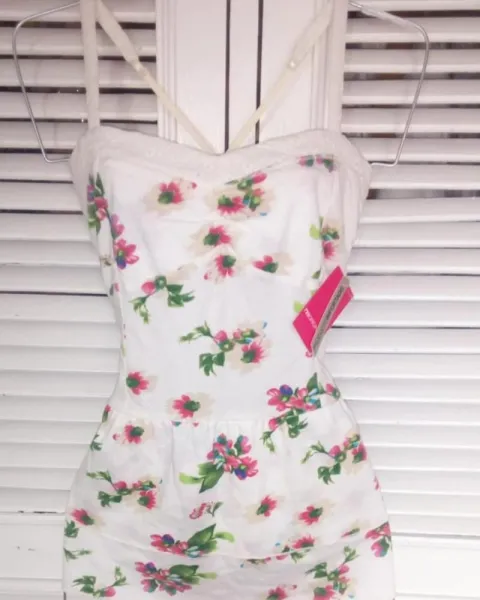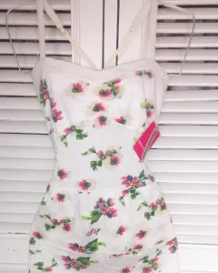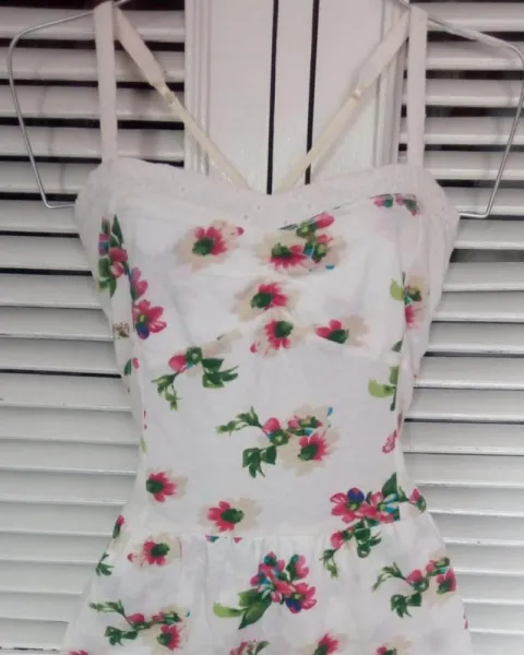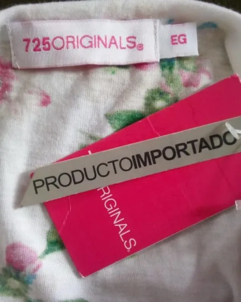 Blusa blanca con flores rosas, azules, moradas y verdes. Con tirantes ajustables, talla EG.