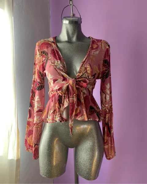 Crop rosa STUDIO F. Divina blusita de manga larga con resorte en los puños, con escote pronunciado en V. Se amarra a la cintura para un efecto peplum. Sus medidas son: 40cm largo, 41cm de axila a axila y 62cm manga. Es de la marca STUDIO F
