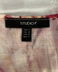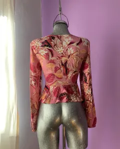 Divina blusita de manga larga con resorte en los puños, con escote pronunciado en V. Se amarra a la cintura para un efecto peplum. Sus medidas son: 40cm largo, 41cm de axila a axila y 62cm manga. Es de la marca STUDIO F
