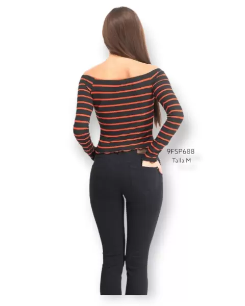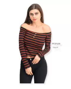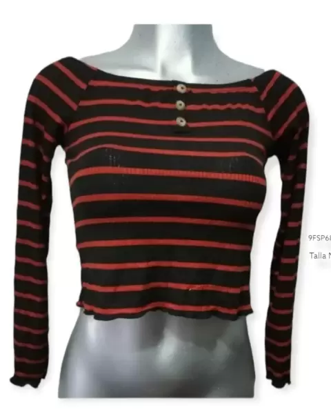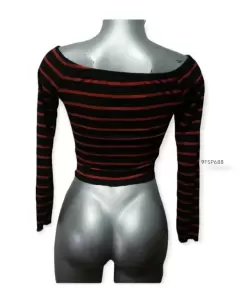 Crop top a rayas rojo con negro. Hermoso crop top, escote de barco, maneja larga, la tela estira. Botones café de adorno. Medidas largo 39cm, axila a axila 37cm, largo Manga 54cm