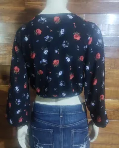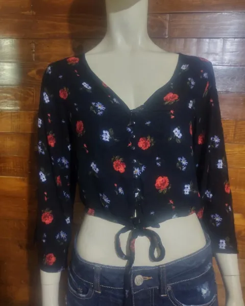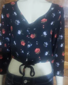 Crop top floral, base negro, talla XS a S Nieva sin etiqueta, sin ningún detalle, marca AMERICAN EAGLE.