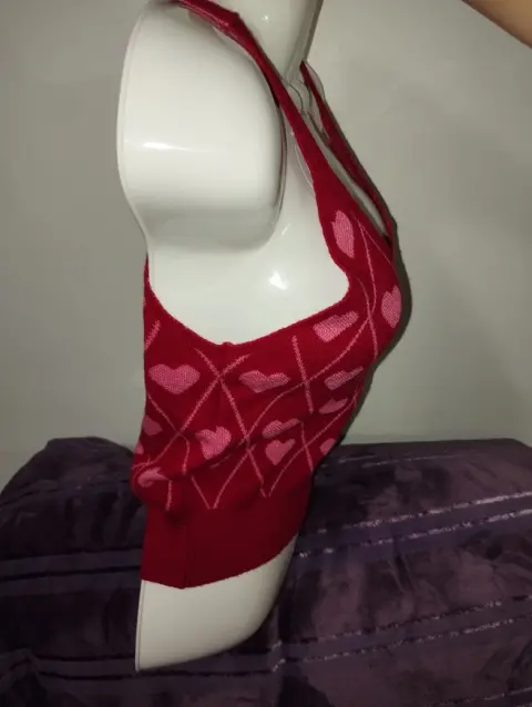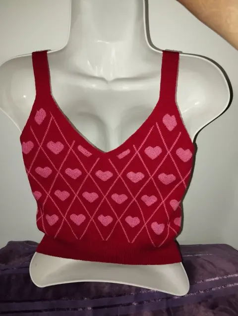 Crop top corazones. Hermosa blusa de tirantes tipo crop top, de punto, con detalles super lindos de corazón, escote V y tejido tipo resorte en la parte inferior, marcado como talla G. Medidas en la última foto ❤️Ideal para un outfit súper kawaii 🩷