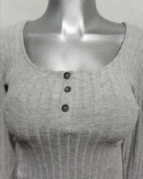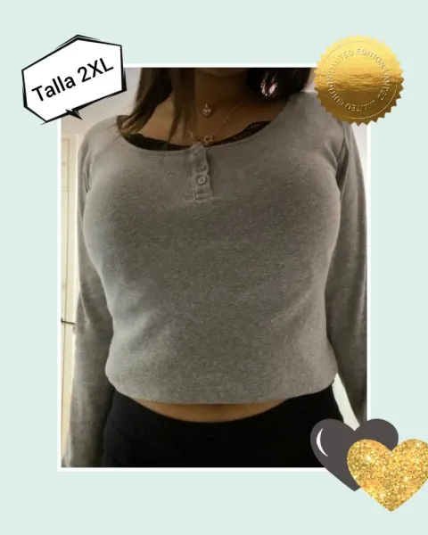 Hermoso crop top gris clarito, 3 botones (solo son adornos), manga larga. Tela super suavesito, muy cómoda y bonita. 48%poliester, 48%rayon, 4%spandexMedidasLargo 48cm, axila a axila 51 cm, hombro a hombro 37 cm, largo Manga 70 cm