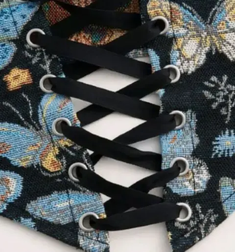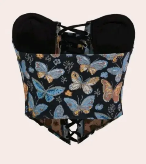 Top de mariposas ajustable con el cordón delantero sin detalles, no es estampado de talla xs con medidas Largo:46.20 Pecho: 81 (medidas en cm)