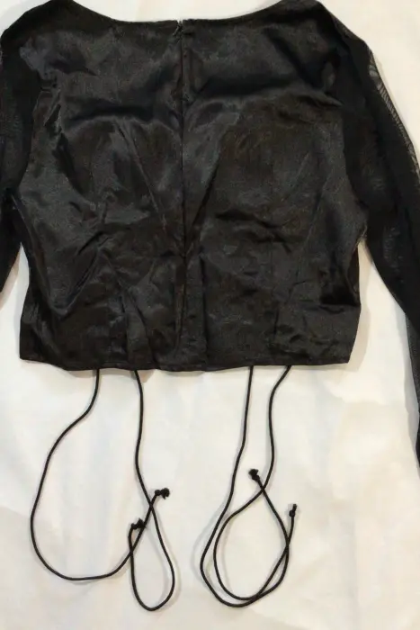 Crop top negra. Blusa tipo top con agujetas negra, la tela es tipo razo y en los brazos transparente, no estira.