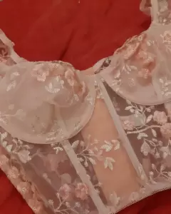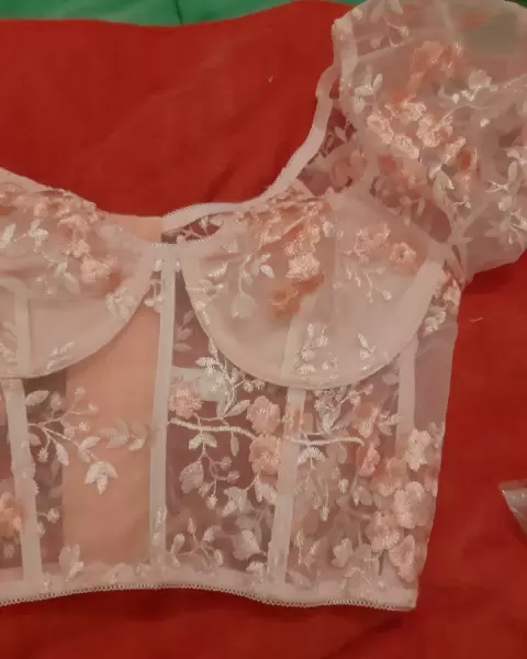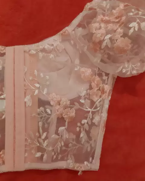 Crop top de tela traslúcida bordada en rosa y blanco con broches en la espalda, tiene mangas farol cortas, es copa B con aros y varillas al frente.