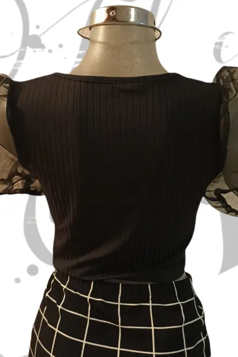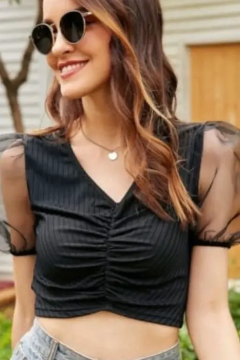 Croptop de mangas transparentes. Hermoso croptop con drapeado enfrente y mangas globo transparente